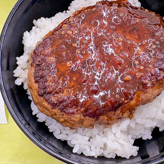 今日のお昼は学食でいただいたんですが、ハンバーグステーキ丼という名の通りの、ご飯の上にハンバーグが乗っているだけのある意味豪快なスペシャルメニュー。