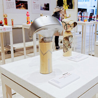 僕は、東北のオリジンってなんろう...ということから縄文をテーマにしてみました。平面作品は遮光器土偶をモチーフにしています。(プリミティブというタイトルは、原初的という意味と、3DCGでいうところのプリミティブ・オブジェクトを中心に造形しましたよ...のダブルミーニングです。)鳴子こけしは、山形から出土した「縄文の女神」をモチーフにしました。銀色のマスク部分は外すことができます。